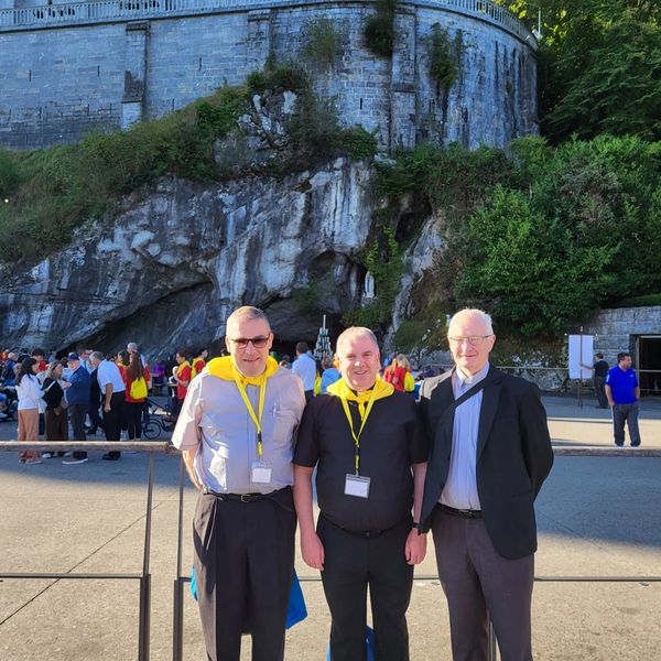 The Pilgrimage Candle in Lourdes - Pictured with Fr. Paul Kivilan, Fr. John Maloney and Fr. Padraig Costello.